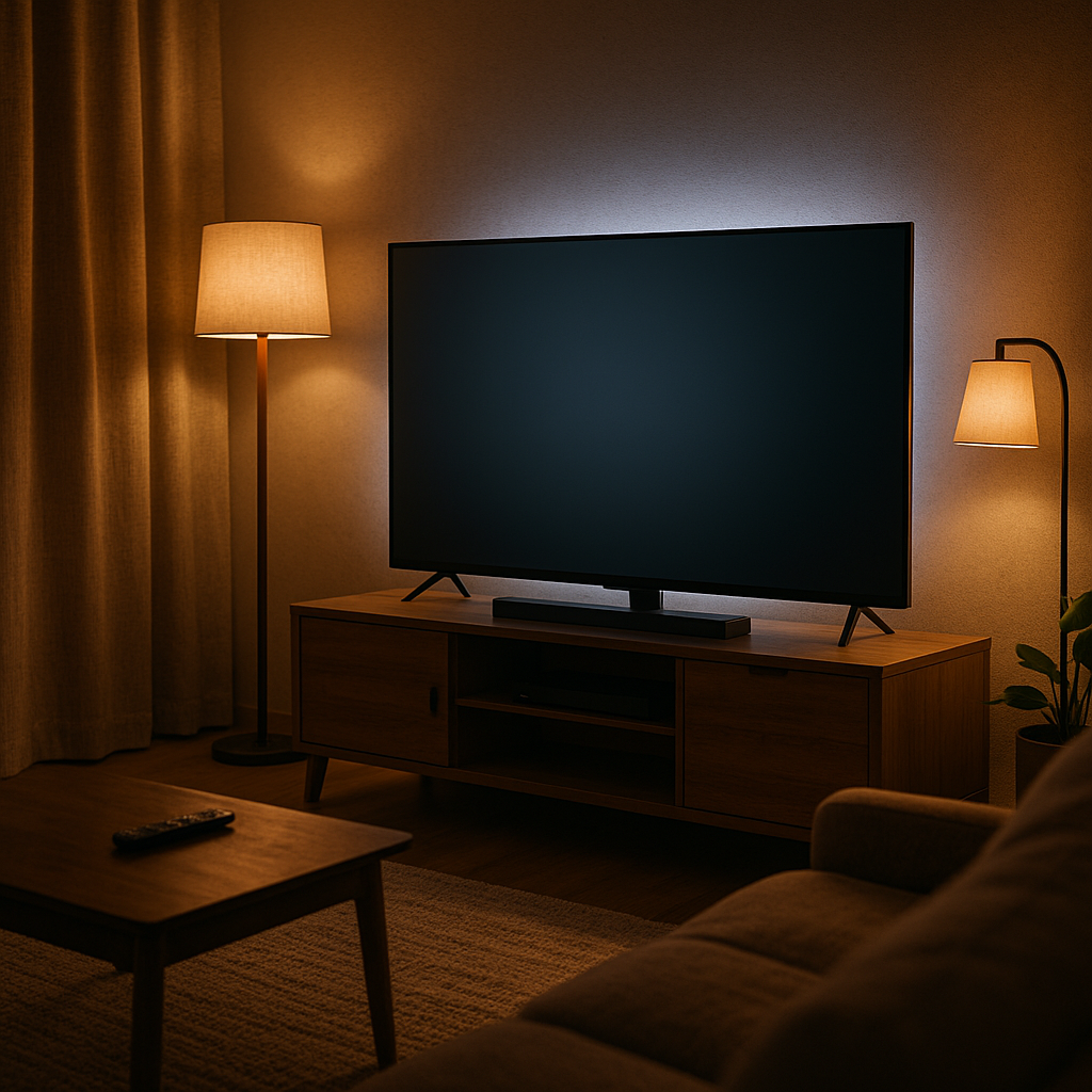 Stuen er medspiller. Tæpper, gardiner og bløde møbler dæmper efterklang, så lyden ikke kastes rundt. Undgå blanke vægge direkte overfor skærmen; en mat overflade mindsker genskin. Sluk for små lyskilder i periferien og brug helst varm, dæmpbar belysning bag eller ved siden af seerpositionen. Træk sofaen et par centimeter fri af bagvæggen for bedre rumfølelse, og centrer siddepladsen mod skærmen. Små rum vinder på ro og symmetri.